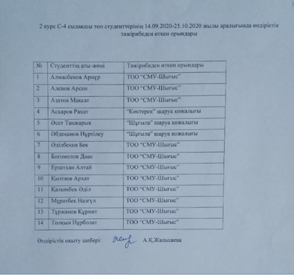 28.09.2020- 23.10.2020ж аралығында студенттердің күзгі өндірістік тәжірибеден