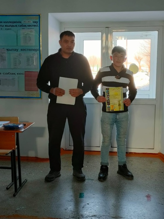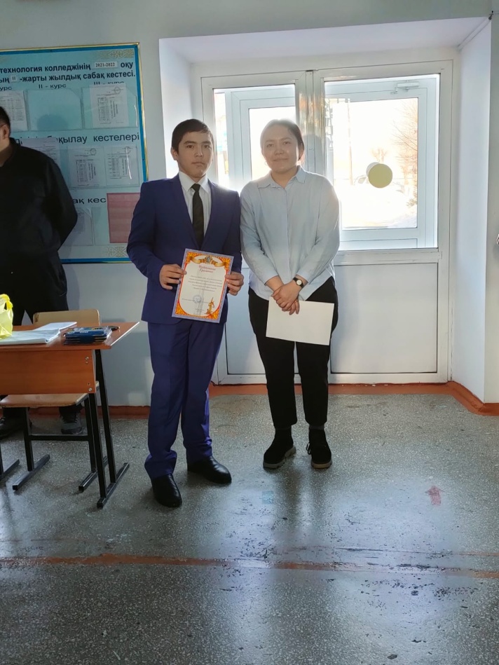 Математика пәні мұғалімі Орынбаева Гүлзат«Талантыңмен таныл» атты сыныптан тыс сайыс сабақөткізді.Мақсаты, студенттердің логикалық ойлау қабілеттерін жетілдіру, тапқырлыққа, шапшаңдыққа, есепқұмарлыққа баулу, пәнге қызығушылығын арттыру, қарым-қатынастарын нығайту болды.Сайыс 7 кезеңнен тұрды: топтың өзін таныстыруы, лездік сұрақтар, логикалық есептер, оқу бағдарламасынанесептер, математикалық жаңылтпаштар, нақыл сөздерді табу, берілген мақалды толықтырып, жауап артындағы формуланы жалғастырды. Әрбір кезеңді слайдтар арқылы көрсетіп,ақпараттық-технология құралдарын қолданды. Сайыста түрлі әдіс-тәсілдер, көрнекі құралдар қолданылып эстетикалық талаптарға сай өте қызықты өткізілді. Сайыс «өте жақсы» деп бағаланды.