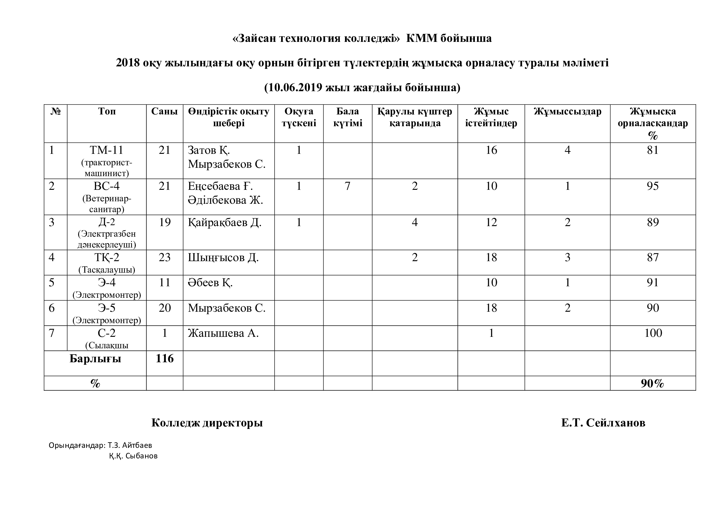 2018 оқу жылындағы оқу орнын бітірген түлектердің жұмысқа орналасу туралы мәліметі