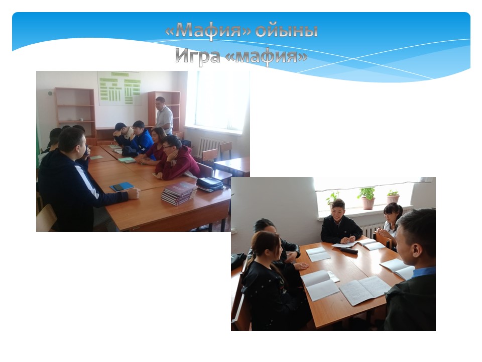 Жүру барысы: Шеңбер болып отырайық. Бір қағазды алып, ұсақтап жыртып, бүктеп сендерге таңдап алуға беремін. Өздерін келіп кез келген қағазды аласындар. Кейбір қағазда «мафия» деген жазулар бар, кімге сол келсе, сол адам мафия. Бірақ бір- бірлеріне айтпайсындар, білдірмейсіндер. Ол сендердің іштерінен біреуді «құрбан» етеді. Сендер бір қаланың адамдарысындар. Түн батты , қала тұрғындары ұйқыға кетті. Сендер көздерінді жұмындар. Тек қана мафия ұйықтамайды. Ол өз таңдауын жасайды да ойыннан шығарады. Таңдалған адам ойыннан шығады. Таңертен адамдар тұрса, олардың біреуін ойыннан шығарыпты кетіпті. Кім мафия? Соны табындар, ал ол білдіртпеуі керек. Мафияны анықтау мақсатында талдау жүргізіп, дауыс беру арқылы анықтайды. Қате таңдау жасалса қала тұрғыны ойыннан шығады да мафия жеңіске жетеді, мафия анықталған жағдайда қала тұрғындары жеңіске жетеді.